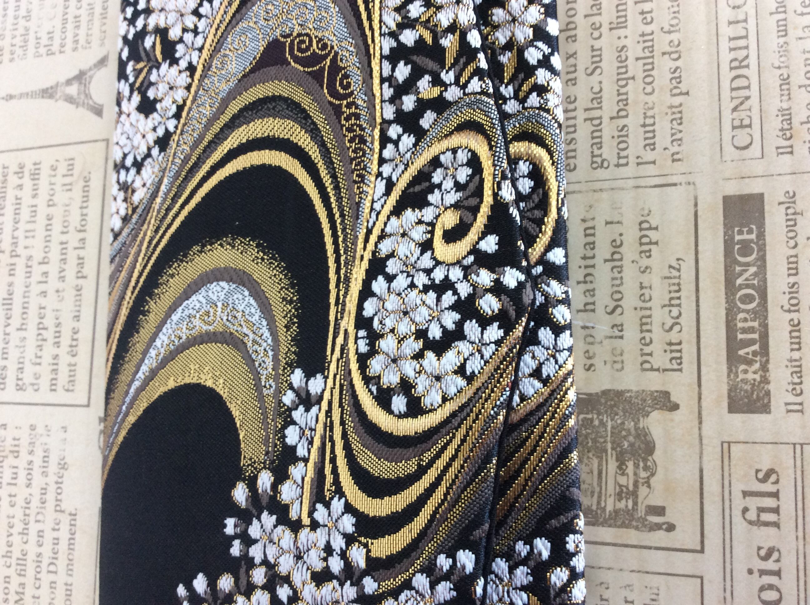 細く切った金箔を織り込み、紋様を顕した布地のことをいいます。